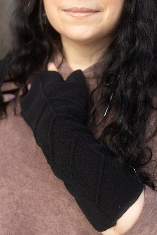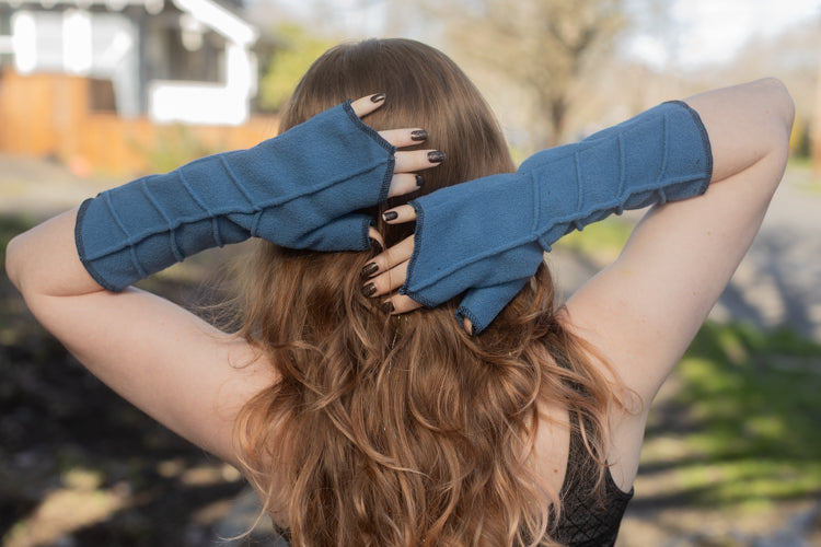 Ridges recall the texture of a leaf and the super soft fleece adds to the ethereal air of these arm warmers. With a comfortable place just for your thumb, and a longer, pointed edge on the hand, they keep all those cold-prone joints cozy. These are great worn alone, but are also fantastic for layering over gloves or similar arm warming attire.