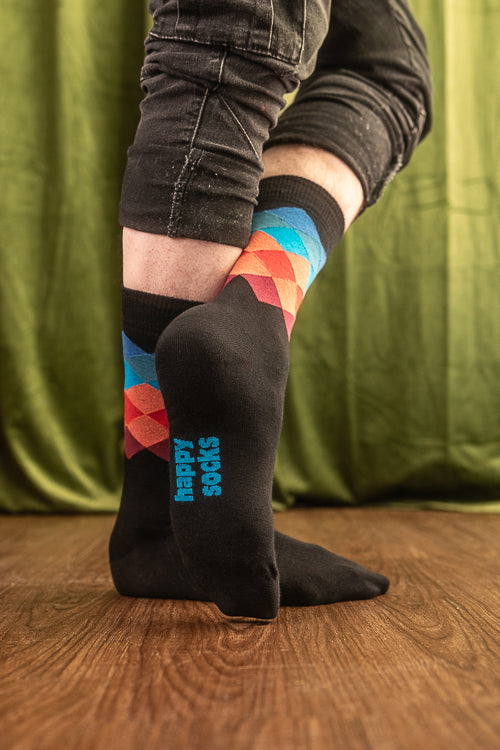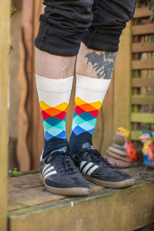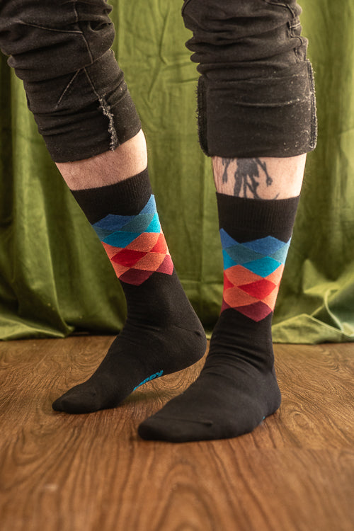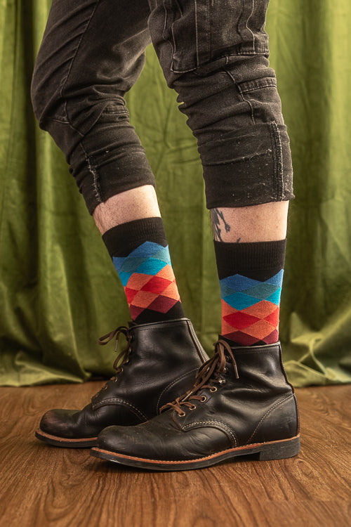 Colorful bands of diamonds are sandwiched between solid feet and cuffs, in colors which almost read as a mountain range at sunrise!