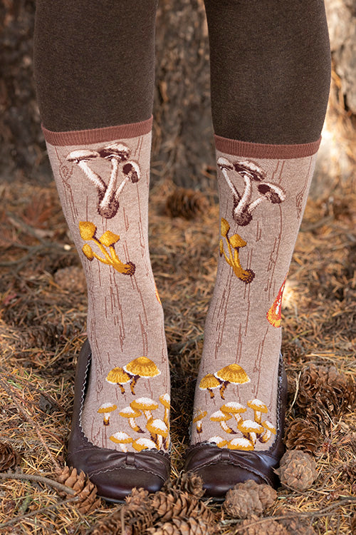 A subtly wood grain patterned sock acts as a log for mushrooms to colonize! Practice identifying chanterelles, morels, amanitas, and other fun guys on these wonderfully woodsy crews!