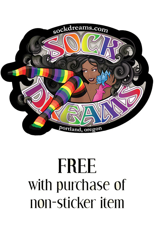 Show your Sock Dreams pride! These stickers are small enough to fit on many phone cases, but large enough to catch the eye on your car bumper. Our sticker proudly wears Proud Stripes thigh highs in Philly Rainbow. Made in the USA.