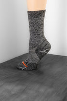 A full cushioned crew is thicker and warmer, in a lovely grey marled color, designed with a smart tiered construction. It features a fine gauge merino wool at the bottom for extra softness, with a more durable knit on top for added strength.
