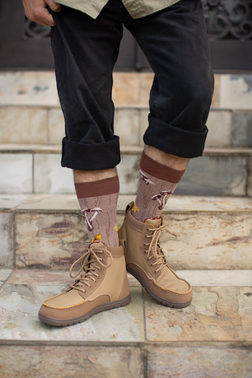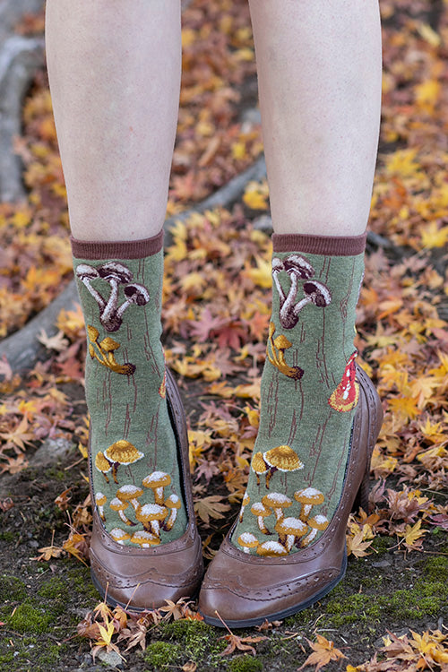 A subtly wood grain patterned sock acts as a log for mushrooms to colonize! Practice identifying chanterelles, morels, amanitas, and other fun guys on these wonderfully woodsy crews!