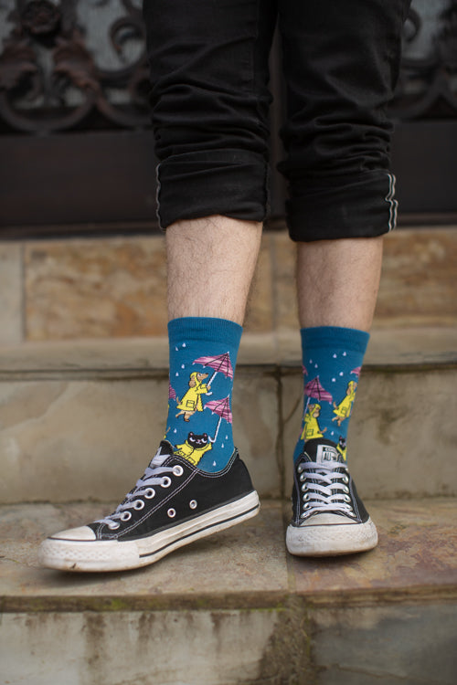 Is there anything better than seeing a pet in a yellow rain slicker? How about the addition of umbrellas? These fuzzy friends are geared up for the deluge of raindrops falling on these deep blue socks. It's raining cats and dogs -- or maybe just on them!