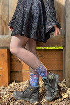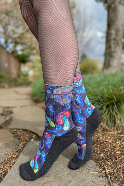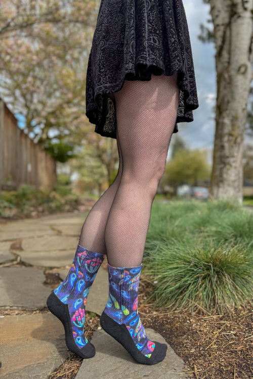 A brightly colored, psychedelic mushroom print adorns these ribbed crew socks, contrasted by a solid black foot bed with the brand "Good Luck Socks" knitted into the sole!