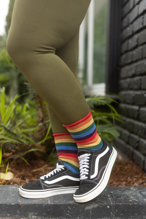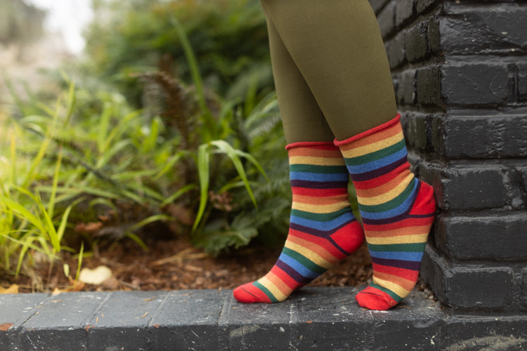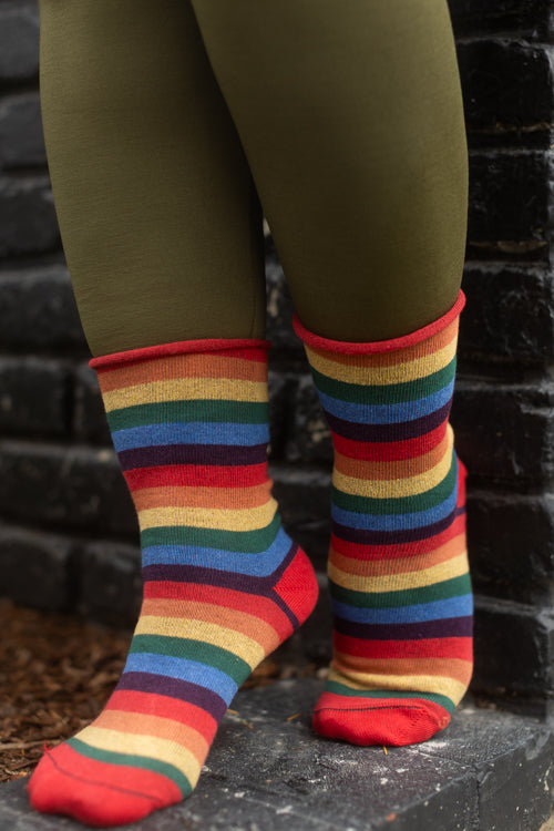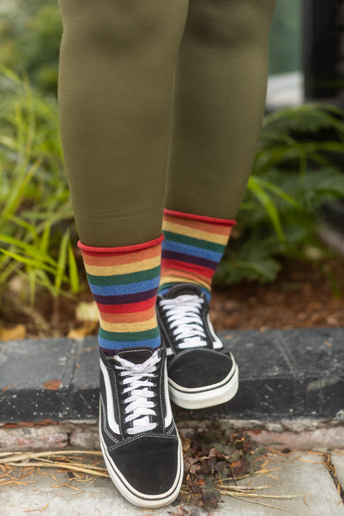 The bold colors and thin stripes of these rainbow socks evokes fond memories of cracking open a fresh box of crayons! Made in the USA with a non-constrictive roll-top!