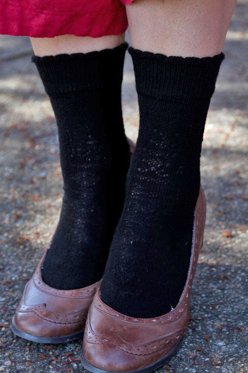 These sweet bamboo crew socks are definitely knockouts! Since the soft silkiness of bamboo just begs for ornament, we added a subtle floral motif from scalloped cuff to toe that opens up beautifully and highlights the loveliness of the yarn. Made in the USA.