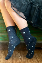 White stars adorn these black ankle socks with blue shimmer. Cuff them down to show the phases of the waxing and waning moon, or keep them pulled up to reveal the phrase, "Just a Phase"!