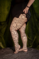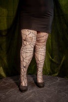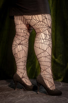 A unique distressed net design gives these tights the look of extra-spooky spider webs! A finer net makes for comfortable toe caps, after which their fabulous pattern runs uninterrupted up to the waistband!