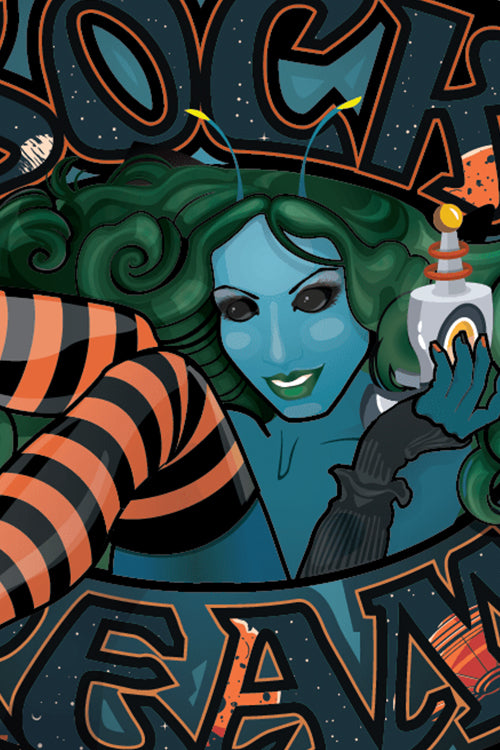 Our mascot is dressed up as an alien for Halloween, complete with blue skin and a ray gun! She sports our Longer Extraordinary Programming Socks in black and orange. Made in the USA.