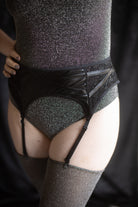 This garter belt has it all going on! A shiny wet look panel is criss-crossed by straps in the front, while sheer lace panels make up the sides, giving way to mesh in the back, where it clasps with a hook-and-eye closure. Four straps with garter clips extend from the front and back, to connect with your stockings!