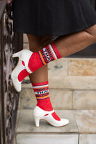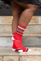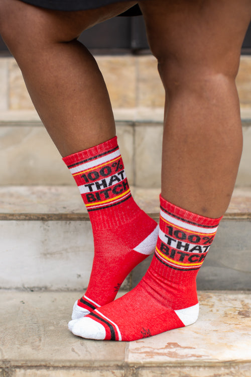 Sporty red socks feature contrasting white heels and toes, top stripes, and the immortal words of Lizzo: 100% THAT BITCH.