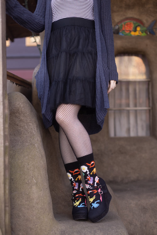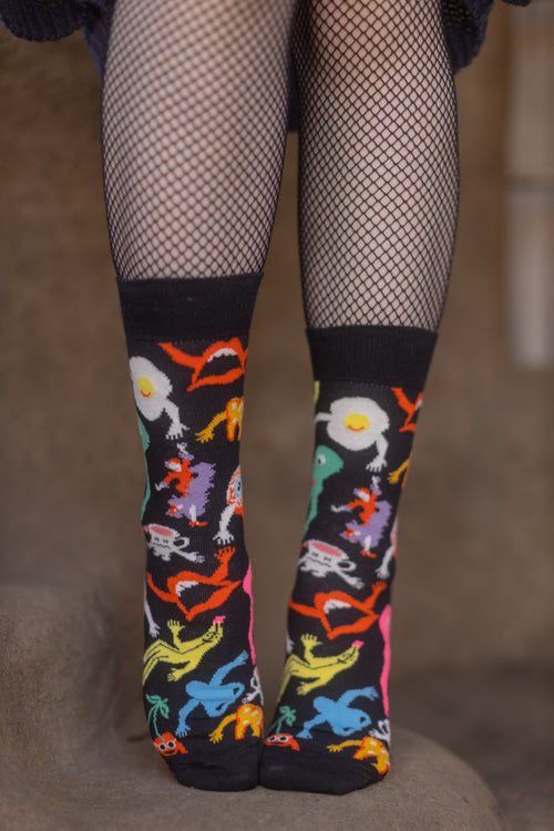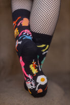 A bright, psychedelic party of monstrous fruits and body parts dance across a black background on these spooky-cute socks!