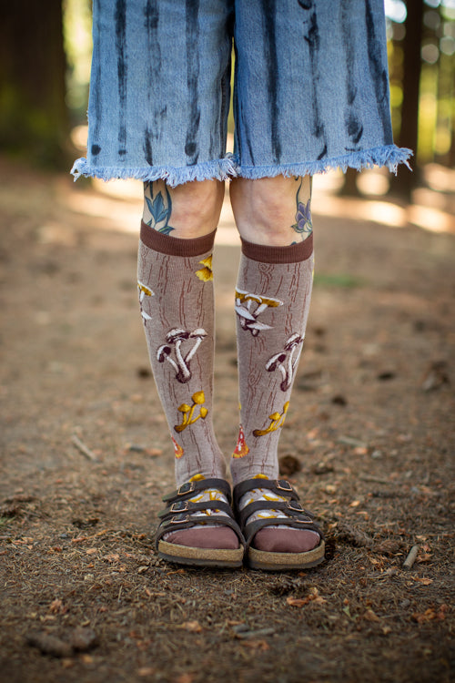 A subtly wood grain patterned sock acts as a log for mushrooms to colonize! Practice identifying chanterelles, morels, amanitas, and other fun guys on these wonderfully woodsy knee highs!