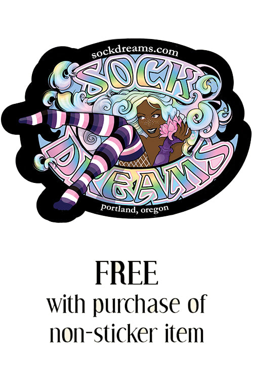 Our logo lady is all dressed up in our Extraordinary Pride Thigh Highs in the genderfluid colorway! Made in the USA!