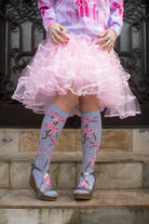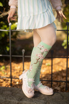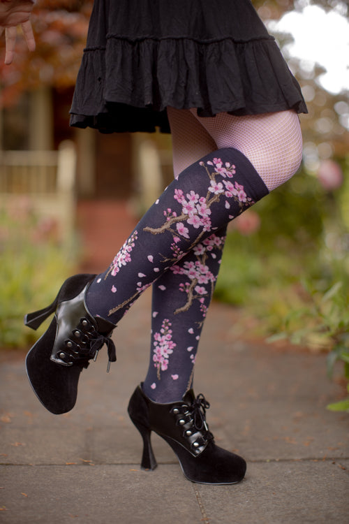 Branches laden with vivid pink cherry blossoms stretch across a lilac sky in these vividly vernal knee high socks!
