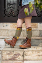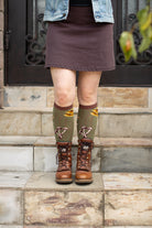 A subtly wood grain patterned sock acts as a log for mushrooms to colonize! Practice identifying chanterelles, morels, amanitas, and other fun guys on these wonderfully woodsy knee highs!