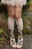Purple blooming thistles adorn these softly heathered cream knee highs, reaching from toe to non-constrictive, roll top cuff. The thistle is the symbol of Scotland, and we think a highly relatable flower for many of us -- beautiful, yet prickly! But take heart -- artichokes are also members of the thistle family, and when not harvested to eat, will bloom a beautiful violet!