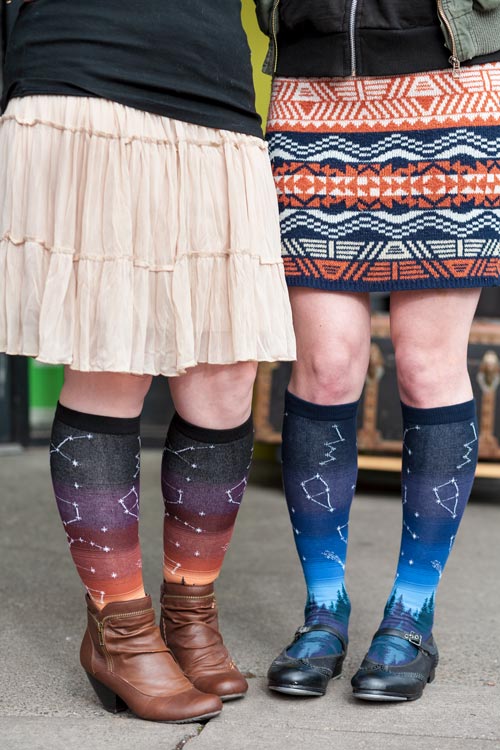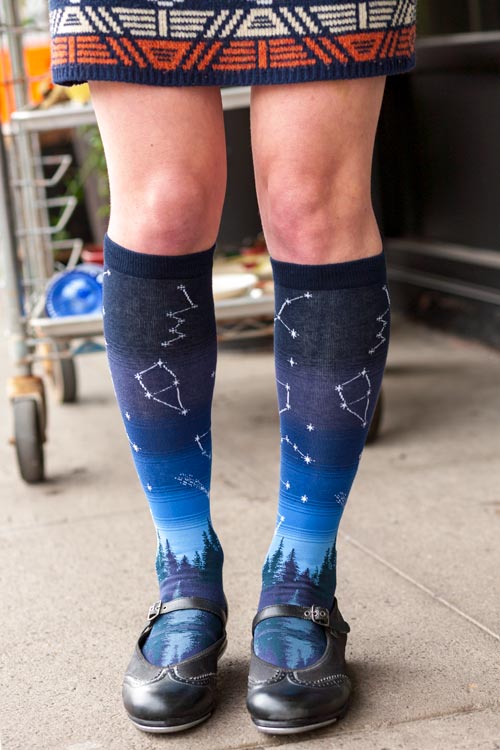These night sky knee highs are about as close as we can get to sleeping under the stars, all year round! The summer constellations of the northern hemisphere are beautifully overlaid on a gradient sky. Below, a multi-layered evergreen treeline is reflected in the calm, dark waters of a lake, reminding us of summer nights in our (and Mod Socks') beloved home -- the Pacific Northwest. How many constellations can you name?