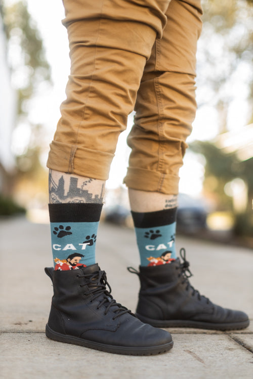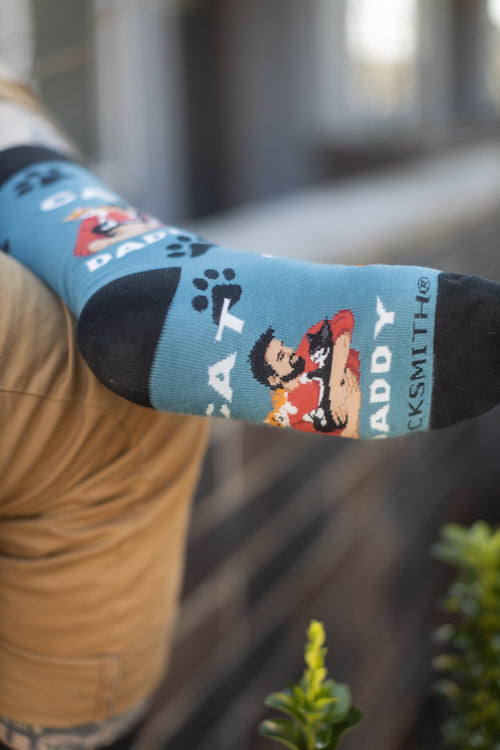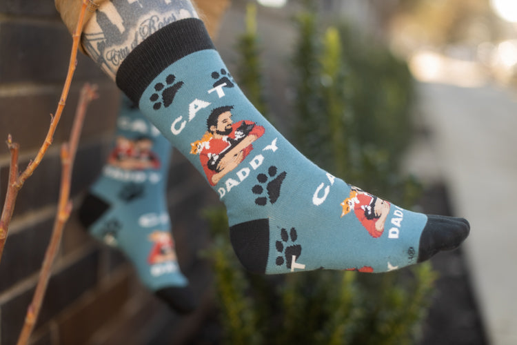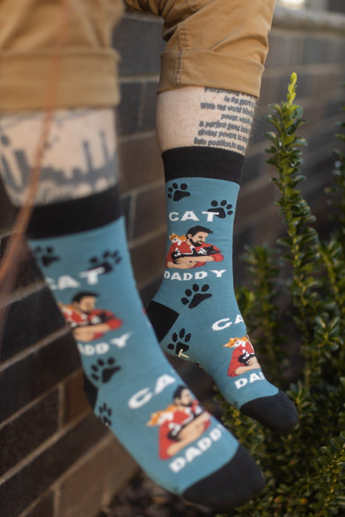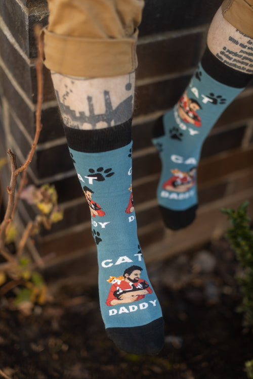 A bearded man lovingly cuddles two cats, surrounded by the words, "CAT DADDY" on these muted blue crew socks! A smattering of black paw prints and black heels, toes, and cuffs add contrast that completes this look.