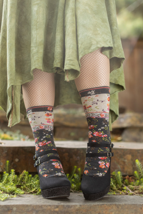 Rich florals flourish from end to end of these lovely cotton crew socks. A band of color adds a beautiful contrast just below the cuff.