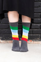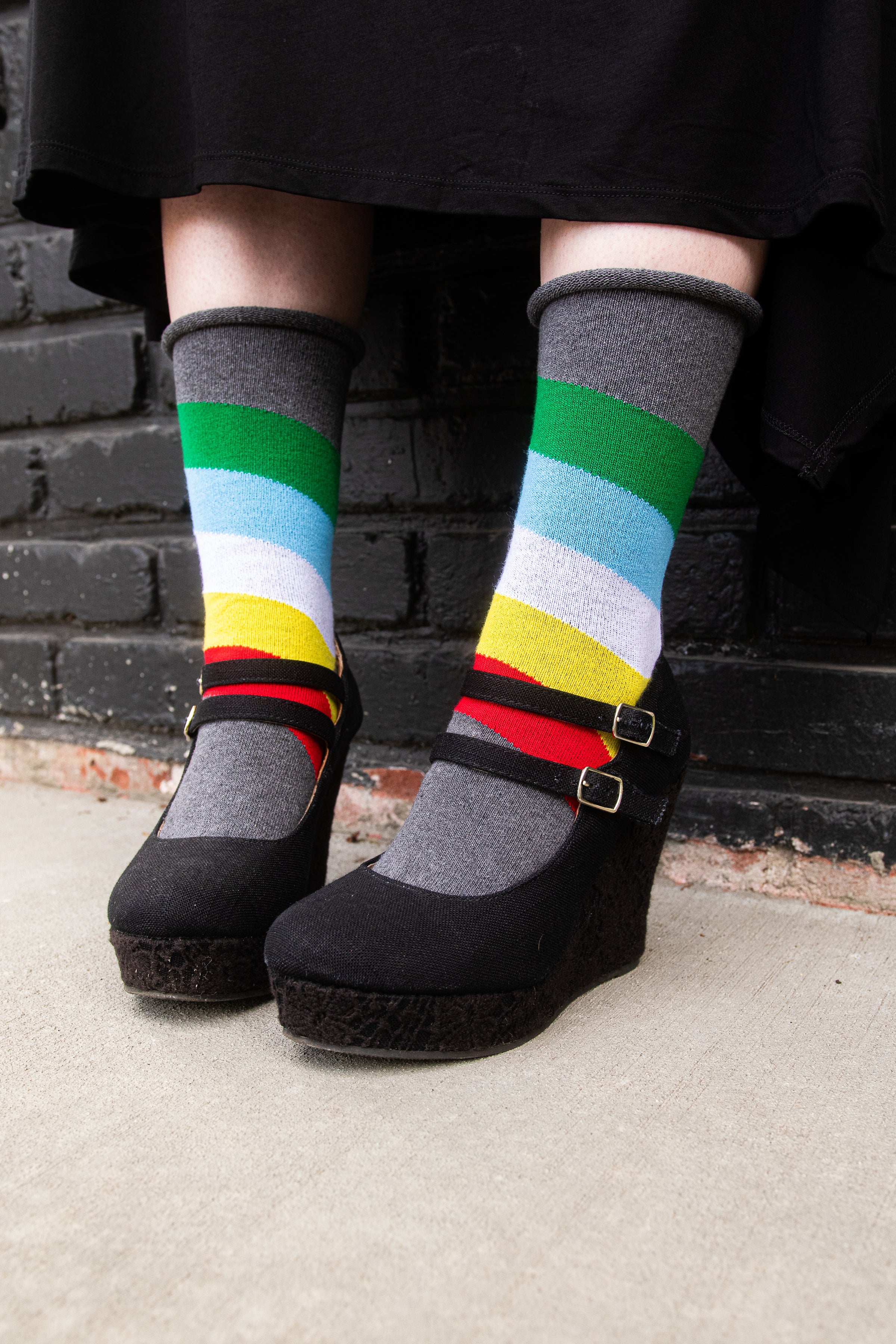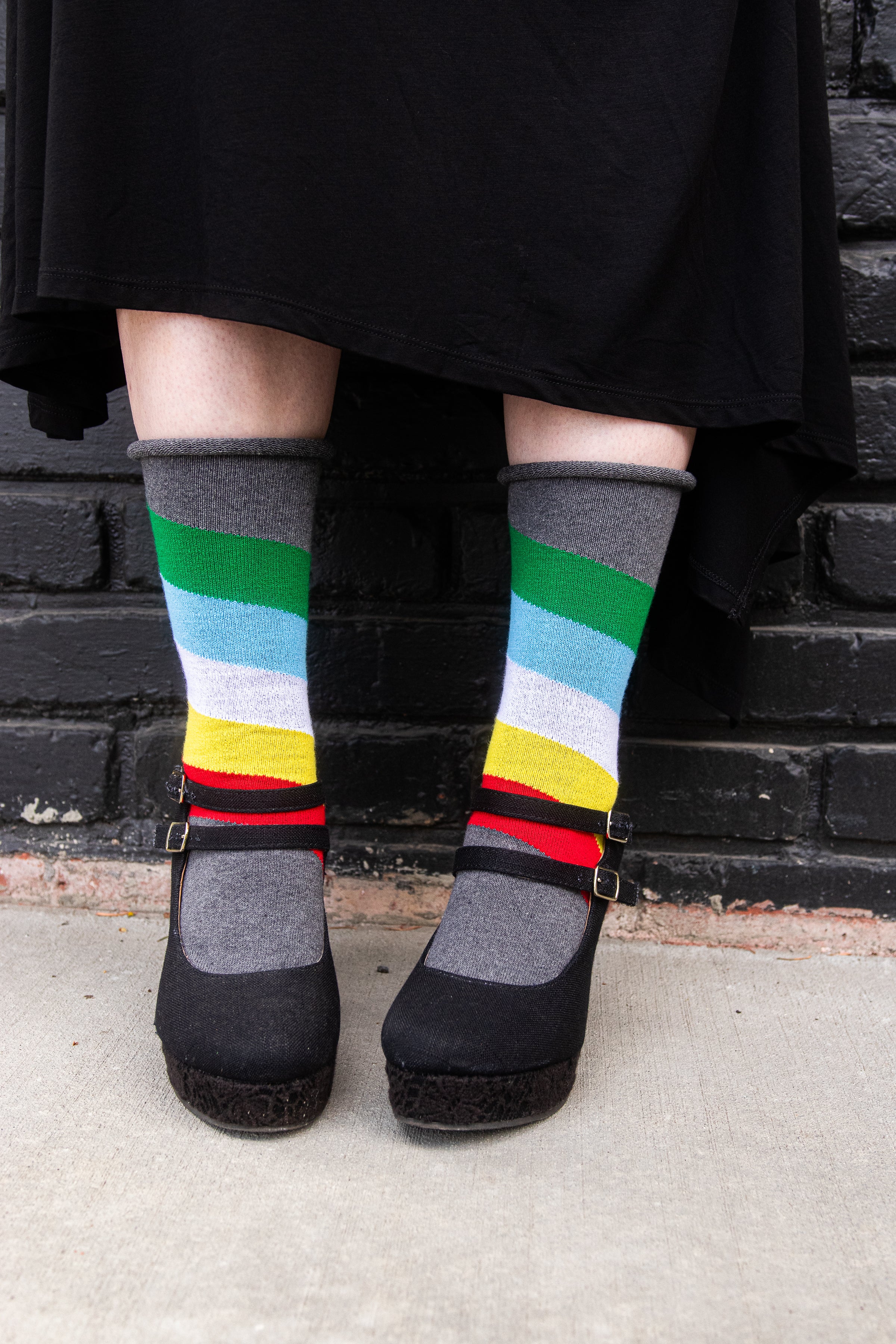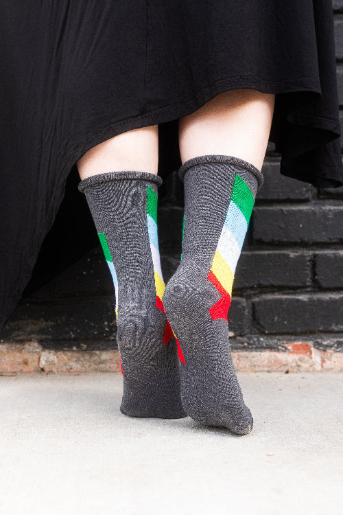 These comfy cotton blend crews are based on the disability pride flag designed by tumblr user capricorn-0mnikorn, in collaboration with several members of the disabled community! We've knitted them up with a non-constrictive roll top for better comfort and sizing range! Made in the USA.
