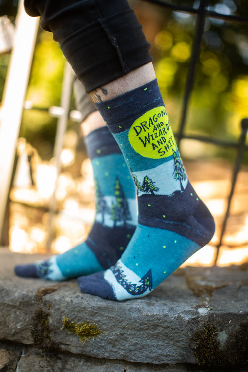 Teal and navy socks feature a mystical looking forest scene at the ankles, and a spikey dragon tail leading to the toes!