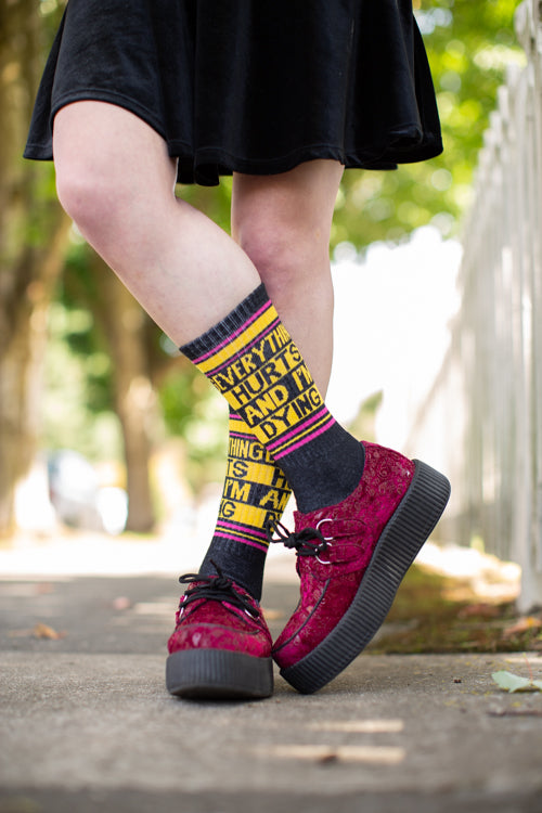 Allow the caution-tape yellow stripes of these black socks (with cute pink accents) to do some of your venting for you, since it's not always socially appropriate to actually scream. Sometimes you've got to sit quietly through a meeting or bus ride, even though you're, you know, dying.