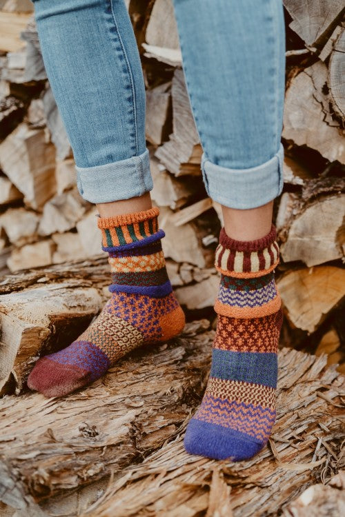 Rich autumnal colors combine for a quirky twist on traditional Fair Isle patterning. Just like a Fair Isle sweater, the colorwork results in a double-thick knit, for an extra-cozy sock! Like all of Solmate's styles, each pair features two mismatched socks, in colors that go together perfectly.