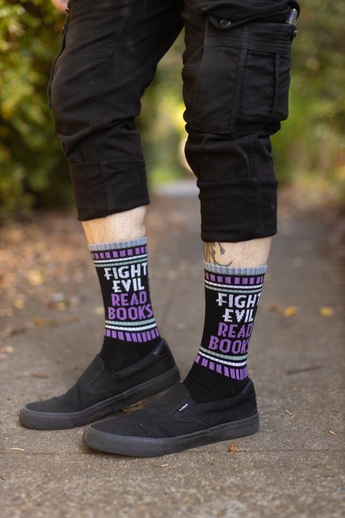 The rallying cry of "FIGHT EVIL READ BOOKS" is knitted into the sides of these black cotton crews, neatly framed in bands of grey and purple.