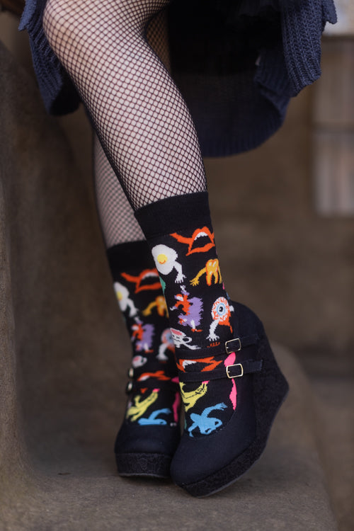 A bright, psychedelic party of monstrous fruits and body parts dance across a black background on these spooky-cute socks!