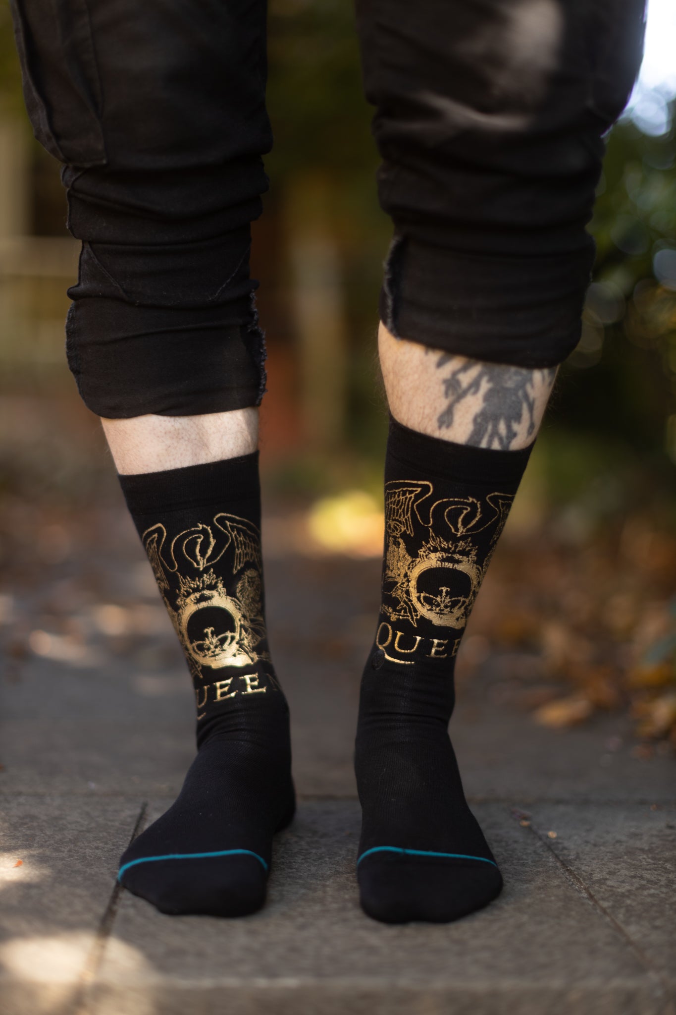 Queen's iconic crest, inspired by heraldry and designed by Freddy Mercury himself, adorns these black combed cotton socks in a metallic gold print!