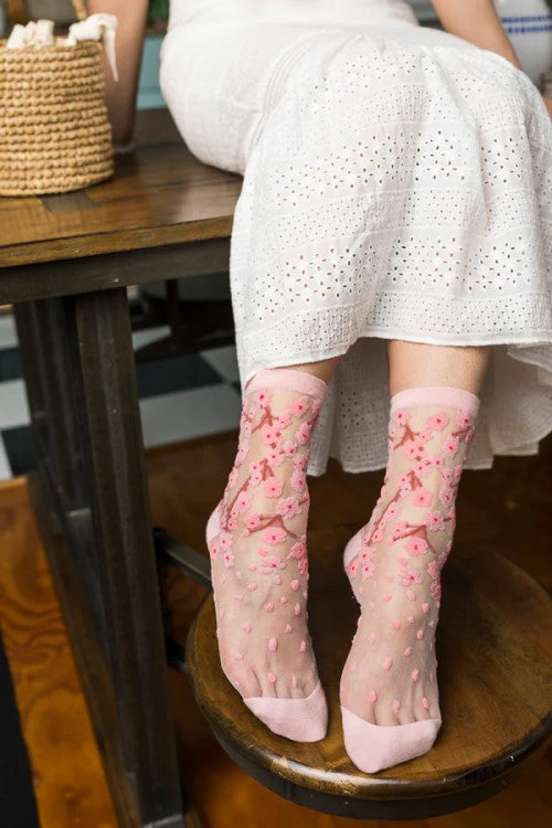 Branches laden with blooming sakura blossoms bend low across the ankles of these gorgeous sheer crew socks, their petals showering the feet with nature's own confetti! Pale pink heels, toes, and cuffs add a sweet accent, as well as extra comfort and durability in high-wear areas.