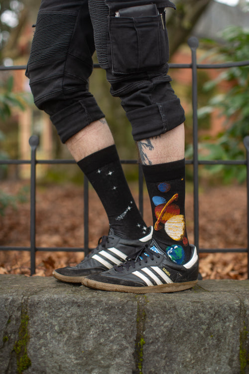 The planets have all aligned in a serpentine row down the outsides of these galactic socks, while yellow toes act as suns! We're not sure what this means, astrologically speaking, but we think it bodes well for your wardrobe!