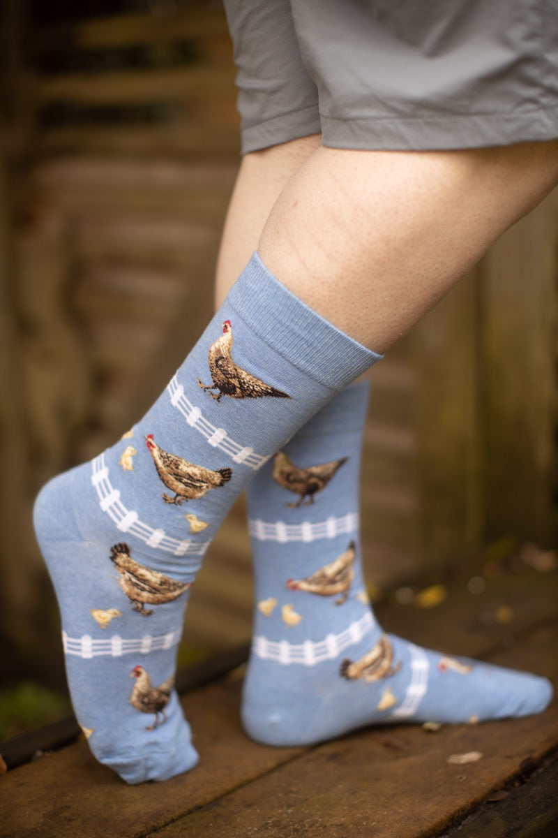 Little white fences form stripes across these sky blue socks, while chickens and fluffy little chicks mingle in between!