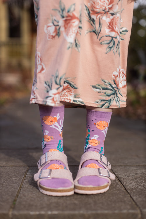 Happy little puffer fish swim through the waters of a lilac colored sea on these cute cotton crew socks!