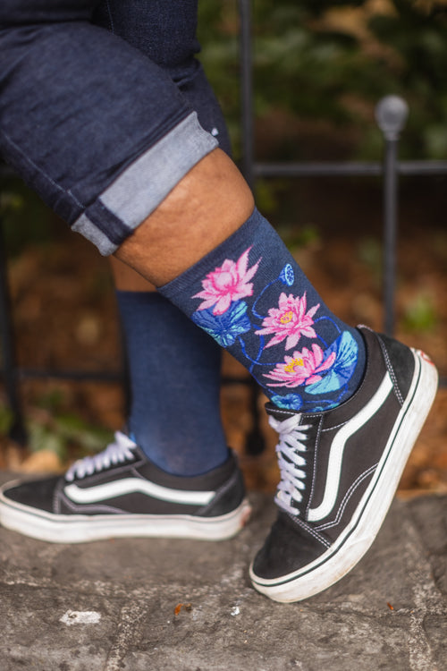 Vivid pink lotus flowers emerge from the depths of these denim blue socks, symbolizing purity and rebirth.