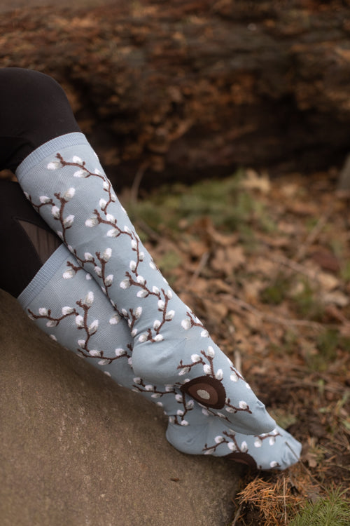 Graceful branches of soft, fluffy catkins zig and zag their way up these sweet pastel socks. These knee highs are sure to put some spring in your step!