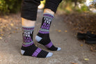 The rallying cry of "FIGHT EVIL READ BOOKS" is knitted into the sides of these black cotton crews, neatly framed in bands of grey and purple.