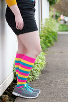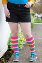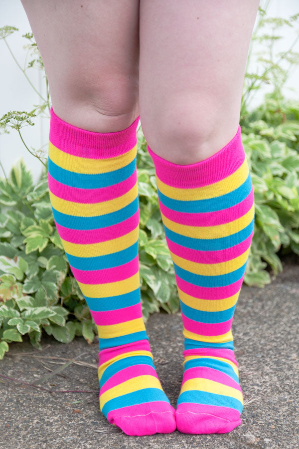 All the same great pride flag colorways as our Longer Original Pride Stripes Tube Socks, only in a shorter version! Because Pride is all about celebrating diversity, we designed these to fit as wide a range of feet and legs as possible! Tube style feet mean that these will comfortably fit most shoe sizes, and will end up being knee high, crew, or somewhere in-between, depending on shoe size. If you’ve been considering sending pride socks as a gift, but weren’t sure which style to get, these will be your safest bet! Proudly made in the USA.
