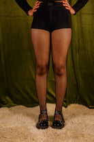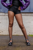 Most of us found these didn't look like they'd fit at first, and then they magically stretched as we put them on. They're not high-waisted, nor low-riding, but a happy medium. The foot pad can be scooted to cover your toes or lower heel, depending on your shoes and preference. If your thighs touch you may want to wear slip shorts or bike shorts with this style, as the tougher fishnet can be uncomfortable when rubbing together.