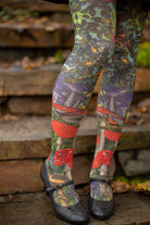 These unique printed tights are like a forest ecosystem for your legs! Brightly colored mushrooms grow from a leafy green floor, while songbirds perch in the canopy above, against a clear turquoise sky.