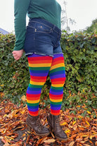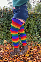 The radiance of these rainbow socks just doesn't stop! Delightfully vibrant rainbows that are achieved with soft breathable acrylic yarns that radiate a spectrum of happy colors, hug you lovingly all day, stretch nicely to fit, and are long enough to fly thigh high! Wear yours with pride! Made in the USA.