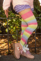 Candy sweet thigh high socks in pretty pastel rainbow stripes. These cuties come with Extraordinary stretch and lots of length, which makes them comfortably over the knee on most legs. Made in the USA.