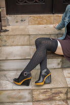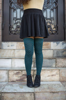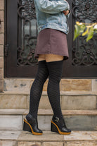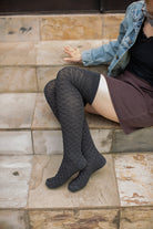 Inspired by the traditional Japanese Seigaiha Wave pattern, the rounded diamonds on these delicately patterned over the knee socks wash across your legs like the swells of the sea. In areas of less stretch, the pattern has a texture that surfaces softly, but stretches with an almost openwork elegance across the swell of your legs. Made in the USA.