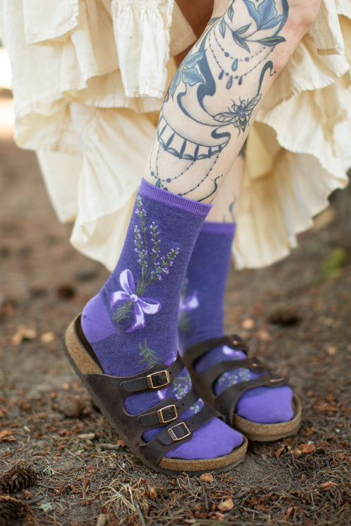 Two-toned purple socks feature bunches of lavender tied up in lilac satin bows! Simple, yet sweet, it was love at first sight with these soft cotton botanical crews!