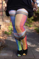 The bold vertical rainbow stripes of these printed tights are intersected by chevrons in white, pink, blue, brown and black, representing the trans and POC members of the LGBTQ+ community!