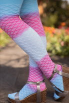Our Longer Diamond Wave Extraordinary Tube Socks make the perfect canvas for stunning gradients inspired by the sea and sky! Diamond patterning forms 3D mermaid scales in areas where they're less stretched, while opening beautifully into a breezy knockout pattern to hug your curves. Their extra-long length means more room for all the gorgeous colors, dip dyed by hand in Portland, Oregon by the one and only Tie Dye Eric! These just might be our dreamiest socks yet!