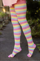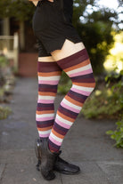 Our super stretchy, super long, super comfy cotton thigh high socks now come in a larger footed size, so that more people can enjoy wearing their favorite pride flag stripes!