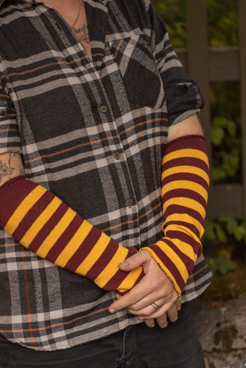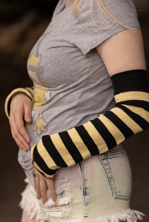 Sleeves are simple tubes, often with at least one finished end, that can be worn on either the legs or the arms. They're great for layering while keeping your hands free!