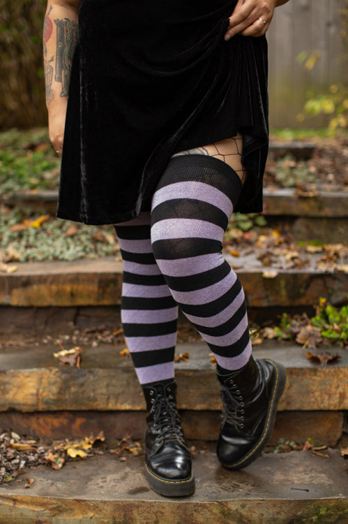 In our never-ending quest to find the longest and comfiest socks for all our sock-loving friends we've taken our super stretchy Striped Extraordinary Thigh High socks and added several more inches, so now they go to the tippy tops of most legs and are comfortably and reliably over the knee on longer and curvier legs! Made in the USA.